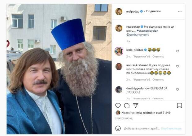 На новом снимке Алексей был в образе священника, с большой цепочкой и головным убором, а на лице была большая борода. Рядом стоял Юрий, который играл роль тамады. "Не отпускает меня эта роль. Скажені сусіди. Юрий Горбунов", - подписал фотографию Потапенко. Фанаты, включая Лесю Никитюк, поставили более 7 тысяч лайков и написали комментарии: "Я уже подумал, что Николаев пластику сделал по омоложению", "Очень идет...))) Все еще может быть! НК в поле матушки - сомнительно", "Ходит по пятам покаяние", "Вам реально эти роли к лицу", "Отец Потап, когда можно на исповедь записаться….", "Если не отпускает,значит проповедуй. Это твоё". Напомним, муж Каменских Потап со щетиной показал свой новый стиль А еще Politeka писала, что Каменских обтянула свои прелести платьем с блестками, Потап не устоял Также Politeka сообщала, что муж Каменских отрастил седую бороду и стал выглядеть на 20 лет старше