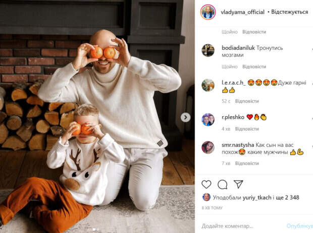 На первом снимке папа и сын играли с мандаринками, приложив их к лицу вместо глаз. На втором фото мужчины смотрели прямо в кадр. На этом фото прекрасно видно, насколько сильно маленький Леон похож на своего звездного отца. Особенно сильно похожи светлые глаза парней. Леон на фото весело улыбался. «Итак, «мандаринно-оливьешное» настроение продолжается, а впереди еще (17!) выходных... У кого какие планы? Признавайтесь!», - подписал фото Яма. За короткое время пост Ямы собрал более 2,5 тысяч лайков. В комментариях ему оставили несколько приятных комплиментов. «Какие вы красивые», «Очень красивые», «Как сын на вас похож, какие мужчины», - пишут пользователи сети. Стоит отметить, что Влад Яма обожает делиться семейными фотографиями. В его профиле много фото с женой Лилией и сыном. Судя по снимкам, парочка регулярно устраивает профессиональные фотосессии. Напомним, что Влад Яма похвастался бицепсами и безумными развлечениями: "Качался...". Как сообщала Politeka, Влад Яма на глазах у всех "утопил" обиженную Никитюк, сюрприз удался: "Доставайте Лесю...". Также Politeka писала, что травмированный Влад Яма с перекошенным лицом показал фото из больницы, что произошло: "Очнулся...".