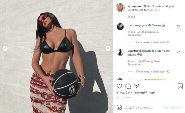 Так, недавно бесстыжая звезда выложила в своем микроблоге пикантное видео, на котором ее можно увидеть во всей красе. Как видно, Кайли запечатлена на залитой солнцем веранде своего особняка. Перед камерой она появилась в вызывающем образе – на ней пестрая юбочка, которая обтягивает упругие бедра, и черный кожаный лифчик, из которого едва не вываливается аппетитное декольте. Волосы красотки распущены и небрежно уложены, а на ее глазах стильные солнцезащитные очки. Дженнер изящно позирует перед объективом, демонстрируя свои сочные формы на весь мир. Светская львица не подписала свое короткое видео, оставила лишь эмодзи, зато фанаты кинулись активно обсуждать ее новый образ. Пользователи просто в восторге от соблазнительного вида Кайли, ее заваливают комплиментами и восторженными комментариями, а эта энергия просто сводит всех с ума. Напомним, Кайли Дженнер в салатовом бикини хорошенько "поджарилась" на солнце: "Комплект на миллион". Как сообщала Politeka, Знойная Кортни Кардашьян показала сочную фигурку в спальне: "Тело мечты". Также Politeka, Сестренки Кайли Дженнер и Кортни Кардашьян показали, кто горячее, приспустив наряды: "Как мамочка".