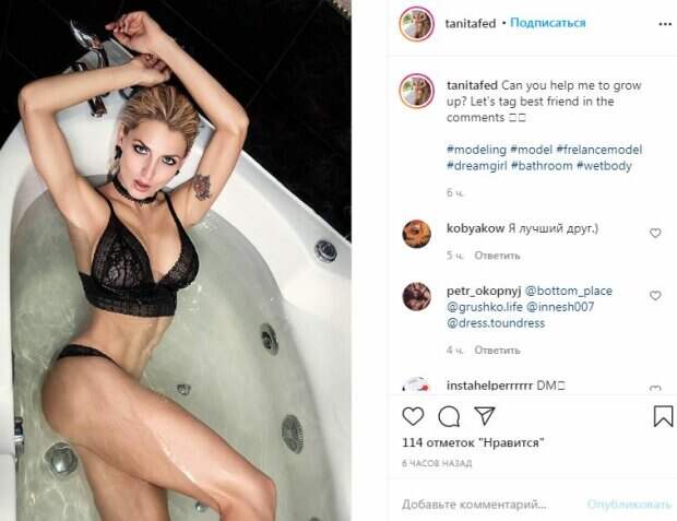 Треугольные лоскутки прикрыли самое сокровенное, при этом тонкое кружево внизу обтянула стройное тело. Тонкая талия и стальной пресс - тоже бросаются в глаза. А чего только стоят упругие ягодицы и накаченные ножки - не оторваться. Татьяна лежала в ванной закинув руки на голову. Звезда пристально смотрела в камеру, ее глаза были подчеркнуты черным карандашом. В подписи модель попросила своих подписчиков отметить друга в комментариях, чтобы развить свой аккаунт. Стоит отметить, что это новая страница Татьяны, а старая на данный момент заблокирована. За пять часов пост собрал более 100 лайков и немного комментариев, в основном, в виде смайликов. Напомним, Татьяна Федосеева модель родом из Запорожья, ей 32 года. Раньше девушка выступала на фитнес-турнирах. Украинка в Инстаграме часто показывает свою фигуру в откровенных нарядах. Так, недавно красотка опубликовала фото в розовом купальнике. Пышную грудь едва удерживали тонкие бретельки. В таком виде звезда позировала посреди пустыни. "Немного розовых снов в твою ленту Instagram