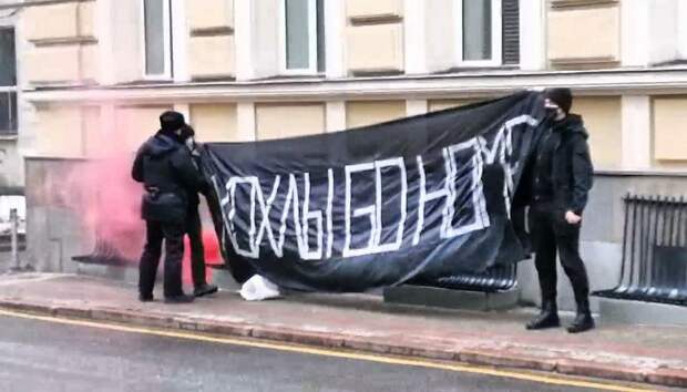 Активисты партии «Другая Россия» (бывшая НБП Эдуарда Лимонова) развернули напротив здания украинского посольства в Москве баннер «Х0хлы, go home!» и зажгли файеры. Об этом сообщает сайт «Другорос», передает корреспондент «ПолитНавигатора».