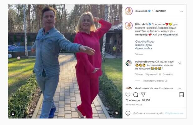 На кадрах пара сначала танцевала в одном наряде, а после этого Лилия сменила свой костюм. В конце видео Ребрик запрыгнула на Андрея, подняв руку вверх. Фанаты сразу засыпали лучезарную пару комплиментами: "Ой, ну, вы крутые. А есть моменты, когда вы не танцуете", "Какие же вы крутые. Очень приятно следить за вами, просто нереально сдерживать улыбку после просмотра подобных видео", "Красивые! Вы эталон, какой должна быть семья! Молодцы!", "Крутые и невероятные, зажигательные и дикие", "Молодцы, зажгли", "Ох и крутит!". Сообщалось, что известная актриса и телеведущая Лилия Ребрик очаровала весенними нарядами и радостным настроением. В сторис своего Инстаграм известная телеведущая, которая стала любимицей, благодаря своему жизнерадостному характеру, показала пять разнообразных нарядов. Напомним, Лилия Ребрик, задрав ногу на камеру, резко ответила украинцам на критику А еще Politeka писала, что Лилия Ребрик зарядила украинцев настроением, устроив танцы в белой маечке Также Politeka сообщала, что встревоженная Лилия Ребрик задела украинцев за живое трогательным обращением