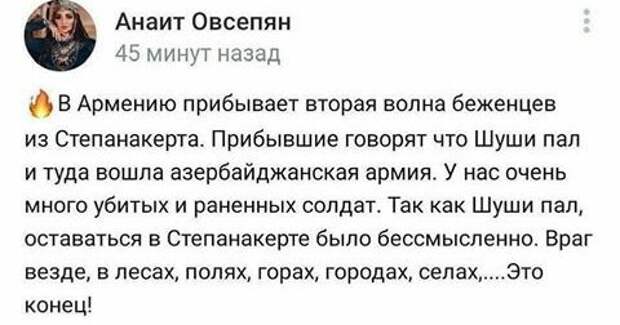 После известия об освобождении #Шуши армянское население #Степанакерта массово покидает оккупированный город и уезжает в Армению #карабах pic.twitter.com/tNPldq7far — Kavkaz Center (@newkc14) November 8, 2020 Как видно на записи, потоку машин нет конца-края. Сами армяне в соцсетях пишут о том, что Шуша теперь под контролем Азербайджана. «В Армению прибывает вторая волна беженцев из Степанакерта. Прибывшие говорят, что Шуши пал, и туда вошла азербайджанская армия. У нас очень много убитых и раненых солдат. Так как Шуши пал, оставаться в Степанакерте было бессмысленно. Враг везде, в лесах, полях, горах, городах, селах… Это конец», – заявила пользователь Анаит Овсепян. Следующим населенным пунктом, который собирается взять армия Алиева, будет столица Нагорного Карабаха Степанакерт. Если у военных получится освободить этот город и взять его под контроль, Азербайджан выиграет эту войну и вернет территории, которые были в оккупации 28 лет. Ранее мы сообщали о том, что 8 ноября азербайджанские солдаты с помощю дрона «Байрактар» и штурмовика Су-25 уничтожили позиции противника, отправив на тот свет и высокопоставленных офицеров армии Нагорного Карабаха. Тем временем российский пропагандист Семен Пегов продолжает утверждать, что Азербайджану не удалось установить контроль над Шушей. В своем телеграмм-канале WarGonzo он написал, что его до сих пор отбивают бойцы «Армии Обороны Арцаха». Уничтожать живую силу противника в «Адском ущелье» им помогает артиллерия. Напомним, Армения осталась без высших чинов после удара Азербайджана. Как сообщала Politeka, Азербайджан не оставил шансов Армении в Карабахе: перерезана главная "артерия". Также Politeka писала, что Азербайджан похвастался колоссальными трофеями на поле боя в Карабахе.
