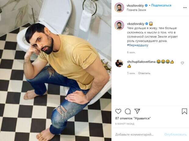 "Чем дольше я живу, тем больше склоняюсь к мысли о том, что в солнечной системе Земля играет роль сумасшедшего дома. #бернардшоу", - подписал этот необычный снимок Козловский. Пользователи кинулись обсуждать увиденное: "В этом что-то есть..." "Локация огонь 😄🔥🔥🔥💙" "Туалет - как раз место для философских размышлений😂" Ранее мы сообщали, Козловский покорил женскую половину Инстаграма, засняв себя в озере. Артист окунулся в воду прямо в одежде и встал в полный рост, продемонстрировав свои рельефы под мокрой футболкой. "Глубоко вдохнул, втянул живот, напряг все мышцы и пошёл-пошёл...😜😋 Как ваше лето? Где отдыхаете и с кем?)", - поинтересовался Виталий Козловский у поклонников. "Аполлон!))"; "Шикарно 😍 Я уже заочно влюблена в эту работу ❤️👍"; "Ну нельзя быть красивым таким) наше весело))), но мы скучаем"; "А еще футболка мокрая. Мокрый секси мачо.🤓😉👍"; "Как прут кубики)", - отреагировали в комментариях. Также мы писали, что бывшая любовница Козловского, экс-участница знаменитого шоу "Холостяк" и основательница популярного канала на Ютуб-платформе "Ходят слухи" Рамина Эсхакзай, поделилась своей бедой. У девушки потерялся щенок по кличке Марси. "Она может быть где угодно. Бегает быстро. Присмотритесь к своим соседям, особенно частные дома, вдруг кто-то приютил. Помогите найти песика за хорошее вознаграждение", - обратилась девушка к неравнодушным. Напомним, Козловский начал ныть и философствовать: что происходит с певцом. Как сообщала Politeka, Виктор Павлик засветился на концерте скандального экс-регионала. Также Politeka писала, что предатель Козловский отличился новым выходкой.