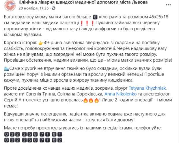 Об этом сообщили на странице Львовской клинической больницы скорой помощи в Facebook. "Жительница Львова обратилась с жалобами на постоянную слабость, головокружение и гинекологические кровотечения. Из-за избыточного веса женщина не чувствовала, что внутри у нее может быть опухоль такого размера. Проведя обследование, медики обнаружили, что это миома матки больших размеров", – отметили медики. По их словам, операция была сложной. Узлы опухоли располагались возле других органов, они вросли в жировую ткань кишечника. На следующий день пациентка смогла самостоятельно передвигаться, а 20 ноября ее выписали. Пользователи сети восхитились украинскими врачами, которые провели эту операцию: "Молодцы, гордимся такими врачами!", "спасибо за то, что вы у нас есть!❤", "это что-то невероятное, как со стороны пациентки 6кг!!! так и мастерства врачей", "Ангелы в белых халатах - вы супер". Напомним, врачи спасают 10-летнюю красавицу, девочка может навсегда остаться инвалидом. Ранее Politeka писала, на островке безопасности в Харькове жуткая авария, врачи спасают ребенка. Как сообщала Politeka, девушка таинственно исчезла в Киеве, фото и что известно.
