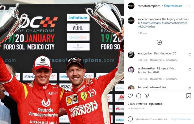 С тех пор сын семикратного чемпиона мира Михаэля Шумахера Мик успел дебютировать в «Формуле-1» (2021 год) и за год до этого стать чемпионом «Формулы-2». «Здорово представлять Германию вместе с Себастьяном Феттелем. Очевидно, что наша цель — выиграть Кубок наций, продолжив успехи команды Германии. Мы оба очень серьёзно к этому относимся! Возможно, у остальных команд, особенно у гонщиков из северных стран, больше опыта пилотирования на льду, но мы постараемся компенсировать этот недостаток мотивацией и упорством», — поделился Мик Шумахер. Гонка чемпионов в этот раз будет проходить в Швеции, по льду Балтийского моря. Соревнования на Кубок наций состоятся 5 февраля, а на следующий день гонщики сразятся в личном зачете. Себастьян Феттель девять раз участвовал в Гонке чемпионов. В 2017 году в Лондоне он стал «Чемпионом чемпионов», а с 2007 по 2012 год, вместе с Михаэлем Шумахером, выигрывал сражения за Кубок наций. «Я снова буду выступать в Гонке чемпионов, вместе с Миком представляя команду Германии. С нетерпением жду этого события. В 2019-м в Мексике мы заняли второе место в Кубке наций, так что наша цель в Швеции — подняться на одну позицию выше. У нас будут сильные соперники, особенно среди гонщиков из северных стран — у них больше опыта пилотирования по снегу и льду», — подтвердил слова своего молодого напарника Феттель. В настоящее время Себастьян Феттель выступает в «Формуле-1» за команду Aston Martin. За плечами Феттеля четыре чемпионских титула «Формулы-1», выступления за четыре команды — Toro Rosso, Red Bull Racing, Ferrari и Aston Martin. Мик Шумахер проводит свой дебютный сезон в «Формуле-1» в команде Haas F1.