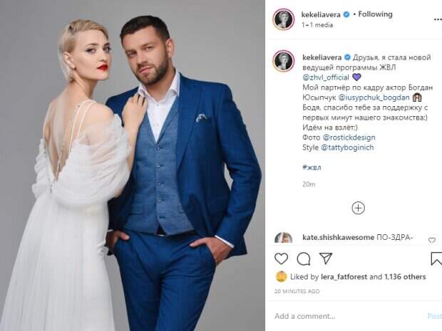 Мой партнёр по кадру актер Богдан Юсыпчук. Бодя, спасибо тебе за поддержку с первых минут нашего знакомства;) Идём на взлёт;)". На опубликованном фото певица с томным взглядом прижалась к своему красавцу-соведущему. На ней надето белое платье из полупрозрачной ткани, которое очень похоже на свадебное. Богдан Юсыпчук предстал в синем костюме-тройке и рубашке с расстегнутым воротником, он скрестил ноги, засунув руки в карманы брюк. Пользователи социальной сети оценили новую телевизионную пару и оставили свои отзывы в комментариях, многие подбодрили Веру Кекелию в новом начинании: "Вауууу! Поздравляю !!!"; "Теперь будет еще интереснее смотреть выпуски, вы же прекрасная"; "Вау ❤️ну круто, теперь можно ее смотреть с удовольствием.