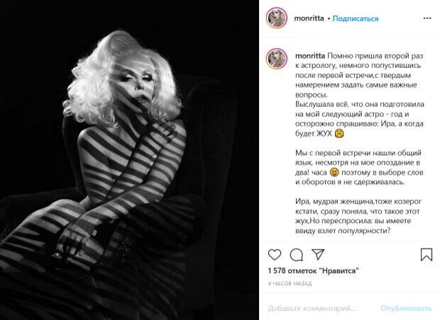Известная украинская шоувумен, травести-дива Монро показала себя без одежды и рассказала о том, как изменилось ее отношение к славе Артистка поделилась новым постом в своем Инстаграм, рассказав о сокровенных переживаниях. Об этом пишет Politeka.net. Так, Монро вспомнила, как много лет назад пришла к астрологу и решила узнать, когда ее ждет резкий скачок популярности.