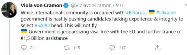 Украина рискует лишиться безвиза с Евросоюзом из-за действий властей Об этом заявила в своем Твиттер евродепутат и член комитета по иностранным делам Виола фон Крамон. Она подчеркнула, что под угрозой оказалось не только соглашение о безвизовом режиме, но также и будущий транш в размере 1,5 миллиарда евро.