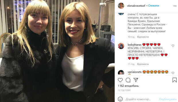 Образ дополняла ожерелье на шее. Кравец стояла рядом с поклонницей и искренне улыбалась. Судя по всему, фото было сделано в гримерке. В комментариях под постом поклонники стали расхваливать внешность звезды. «Красавицы», «Красивая, очень! С потрясающим юмором, ах, нам бы, да в Камеди Вумен, Уральские Пельмени, Однажды в России - Вы - классная! Любим всей семьей, следим за выпусками!», «Красивые, стройные, волшебные, несравненные, неповторимые, и просто великолепные», «Какая красота», - пишут пользователи сети. Ранее мы писали, что Елена Кравец поделилась с поклонниками любимыми сериалами. По словам актрисы, она подсела на Нетфликс, и уже успела пересмотреть множество картин. Среди фильмов оказался сериал «Корона» и мини-сериал «Метод «Комински». Также Елена рассказала, что смотрела нашумевший сериал «Большая маленькая ложь» и «Два Папы». Напомним, что замужняя Кравец из "Квартал 95" публично пофлиртовала с известным красавчиком: "Можно я пожму...". Как сообщала Politeka, Кравец из "Квартала 95" сняла на камеру секретное занятие своих детей-близнецов: "Мы не хотим признаваться". Также Politeka писала, что Кравец из «Квартал 95» вернулась в Кривой Рог, родителям звезды потребовалась помощь: «Ребята, нужно…».