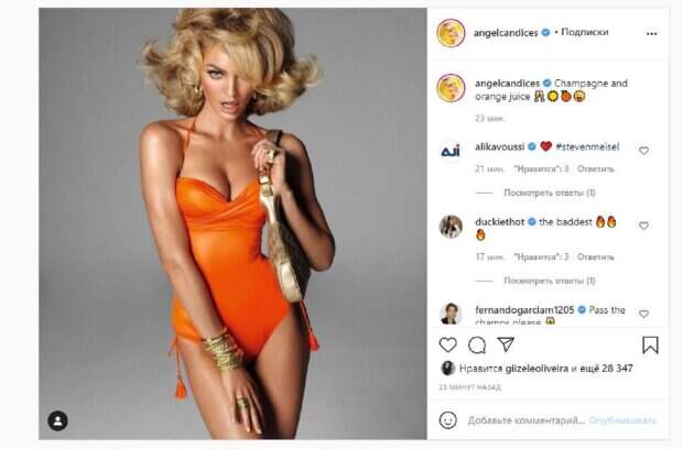 Модель настолько известная, что за ней следят 15 миллионов фанатов в Инстаграм, где Кэндис радует интересными образами. "Шампанское и апельсиновый сок", - написала Свейнпол под фото. На фото Кэндис появилась в оранжевом боди с большим декольте, а образ дополнила стильной сумочкой. У красотки была эффектная прическа и множество украшений на руке. Фанаты сразу принялись засыпать комплиментами звезду: "Самая плохая девочка", "Пожалуйста, проходите, чемпионы", "Супер великолепно", "Служу вам, королева", "Культовая фотосессия", "Красивая, счастливой Пасхи, милая". Мы писали, что известная модель Кэндис Свейнпол из "Victoria’s Secret" похвасталась формами на природе. На кадрах Кэндис позировала посреди поля. На первом фото она была в белом топике, бретельки которого соскальзывали с плеч. Упругий животик впечатлял красотой. Звезда держала у губ ромашку, и, закинув волосы набок, смотрела в камеру. Напомним, роскошная Кэндис Свейнпол из "Victoria’s Secret" в крошечном бикини изумила позой. А еще Politeka писала, что полностью раздетая Кэндис Свейнпол из Victoria’s Secret воссоединилась с природой на пляже. Также Politeka сообщала, что Кэндис Свейнпол из "Victoria’s Secret" восхитила одновременно растяжкой, стройным телом и пейзажем.
