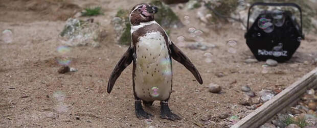 Из-за карантина пингвины зоопарка в британском Ньюквее долгое время не видели людей. Известно, что птицы - существа социальные, поэтому нуждаются во внимании.Так как посетителей нет, пингвины сильно скучают и перестают двигаться. Сотрудники зоопарка решили исправить ситуацию и подумали заказать на Amazon генератор мыльных пузырей, который мог бы отвлечь птиц.