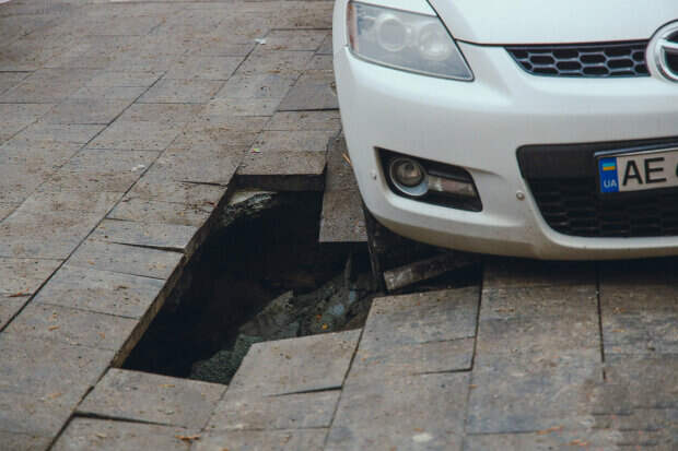 В Днепре, практически в самом центре, 9 февраля под машиной провалилась тротуарная плитка. Об этом сообщает "Информатор". Инцидент произошел на улице Ивана Акинфеева. Под припаркованной Mazda образовалась яма. В которой машина застряла передним колесом. По словам свидетелей глубина пропасти более одного метра.