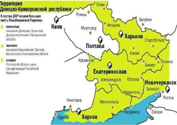 Глава ДНР Денис Пушилин опубликовал историческую карту Донецко-Криворожской республики, включающую Харьков, Днепропетровск и Херсон. Впоследствии эти регионы, как и Донбасс, вопреки воле местных жителей были включены большевиками в состав Украинской ССР. «Сегодня исполнилось 104 года со дня провозглашения Донецко-Криворожской республики.