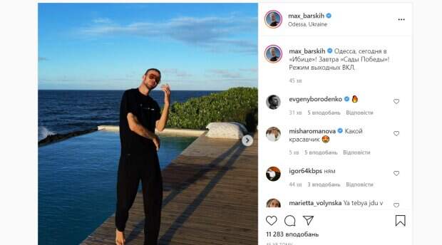 На фотографии Макса можно увидеть на фоне моря и бассейна. Как видно, артист вышел босиком на террасу – на нем темная футболка и черные штаны. Похоже, исполнитель живет в апартаментах с шикарным видом. На втором фото Макс показал, как он идет по террасе с бокалом. В подписи к фотографиям Барских написал: "Одесса, сегодня в «Ибице»! Завтра «Сады Победы»! Режим выходных ВКЛ". Поклонники тут же принялись активно обсуждать новые снимки певца: " Какой красавчик