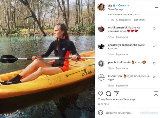 Девушка сидит на желтой байдарке с веслом, вокруг девушку окружала нежная зелень и зеркальное озеро, манящее невероятной красотой. Ноги девушки оголены, и завораживают своей длиной. Даже известная певица MARUV поставила лайк под постом Аллы. Фанаты не стали сдерживать эмоций и откликнулись на фото, воспевая красоту и нежность известной модели. "Красива жінка прикрашає будь яке місце❤️", "О, заезжайте в гости в Форт Маерс