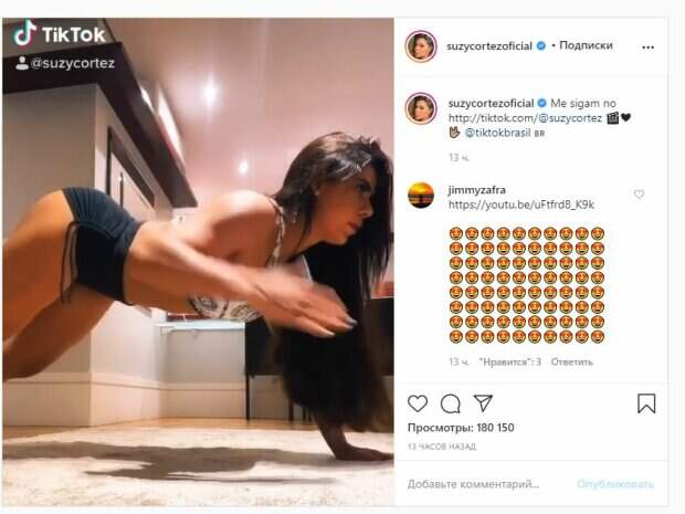 Волосы Кортес оставила распущенными, а сама смотрела в камеру. Об этом пишет Politeka.net со ссылкой на страничку знаменитости. Фанаты поставили более 20 тысяч лайков и написали комментарии: "Доброе утро, красотка", "Ох и ах", "Прекрасная", "Мамочки", "Богиня", "Доброе утро, прекрасная", "Хорошо". Сообщалось, что знаменитая модель Сьюзи Кортес как зажигает во время очередного челленджа. Знаменитая модель, которая ранее победила в конкурсе Мисс Бум Бум, а также получила довольно неоднозначный титул, показала, как выполняет необычный челлендж для приложения "Тик-Ток". Сообщалось, что знаменитая модель Сьюзи Кортес порадовала фанатов новым кадром из тренировки. Знаменитая модель, которая ранее победила в конкурсе Мисс Бум Бум, а также получила довольно неоднозначный титул, впечатлила новым фото с тренировки. Отметим, в конкурсе, как понятно из названия, оценивались именно ягодичные мышцы. Напомним, обладательница самых красивых ягодиц в крохотном белье позволила снять себя сзади А еще Politeka сообщала, что хозяйка самых красивых ягодиц пошалила в самолете в одних белых кружевах Также Politeka писала, что хозяйка легендарных ягодиц восхитила танцем в мини-шортах