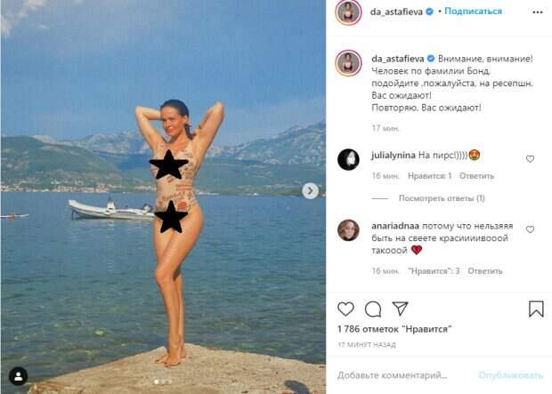 Загорелая брюнетка с мокрыми волосами стояла на пирсе, демонстрируя аппетитные формы во всевозможных ракурсах. Девушка то подымала руки, то ставила их на пояс, выпячивая соблазнительную "пятую точку". "Внимание, внимание! Человек по фамилии Бонд, подойдите, пожалуйста, на ресепшн, Вас ожидают! Повторяю, Вас ожидают!", - пошутила в подписи красотка. Пользователи подхватили "игру" Астафьевой, засыпав девушку приятными комплиментами в комментариях: "На пирс!))))😍" "потому что нельзяяя быть на свеете красиииивооой такооой 💔" "Просто шикарна, богиня👍💣" "Ну тут скорее Бонду нужно ожидать... такая красотка!" "Гм. Обычно он сам приходит. Ночью. С шампанским и клубникой))" "Какой Бонд???к такой афродите минимум "Зевс"!!!🤤" "так и влюбиться можно" "Даша, жду Вас в Сочи в морпорту, Ваш Бонд)" Ранее мы сообщали, Астафьева в красном купальнике переплюнула саму Памелу Андерсон из сериала "Спасатели Малибу". Дело в том, что образ украинской красавицы был очень похож на героиню звезды Голливуда. "Строю из себя, в перерывах между рыбалкой😂", - подписала кадры довольная артистка. Фанаты обезумели от ее горячего фото: "Мой ангел ❤️"; "И строить не нужно, когда ты неимоверной красоты 😘"; "Ну як можна быть такой красивой? ???💕"; "Можешь себе позволить ❤️"; "Хорошо из себя строите👌😊". Напомним, жаркая Даша Астафьева без макияжа показала все свои штучки: "Шэрон Стоун в молодости" Как сообщала Politeka, фигуристая Даша Астафьева едва не засветила лишнее, задрав ноги в легком платье: бесстыжие кадры Также Politeka писала, что роскошная Астафьева в красном показала, что значит совершенство: «Нельзя быть такой…»