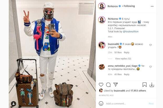 Образ поп-короля российской эстрады дополнили разноцветные очки, защитная маска, а также игрушечный фламинго. Стоит обратить внимание на седые кудри, которые выбиваются из-под кепки, вероятно, Филипп Киркоров решил обойтись без парика. Певец сделал селфи в коридоре у запакованных чемодана и рюкзака, изобразив пальцами знак мира. "В путь! Кто первым угадает куда ✈️ - тому коробку «музыкальных» носков! 3.2.1. Поехали!", - предложил Киркоров в описании к фото. Пользователи попытались угадать место назначения исполнителя и оценили его внешний вид в комментариях, даже Ольга Бузова не смолчала: "Я знаю