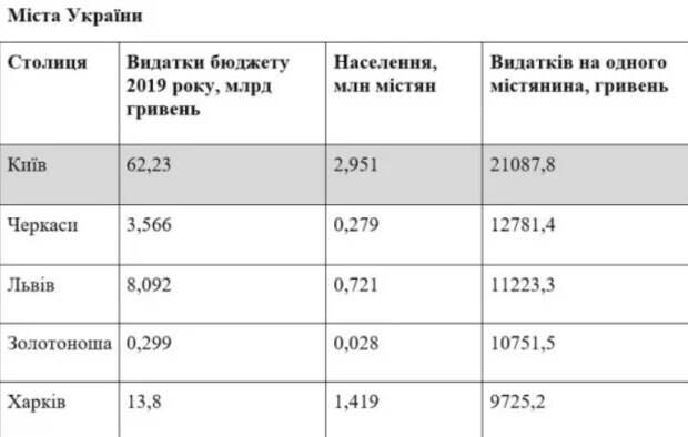 Кличко, окрім ноги у «гіпсі» і костилю, нічого не пропонує – що пропонувати, якщо результати роботи видно й так. Єдиною стратегією може бути стратегія в інтересах киян, заснована на співволодінні й співуправлінні, де кожен киянин - співвласник і отримує свою частку прибутку. А поки що всі права киян з успіхом відібрано, і повернути ці права може тільки міський голова, який поверне киянам все їхнє, збереже й примножить в об’єднані з такими ж, як він, однодумцями. Стосовно Кличка, то йому необхідно зробити неймовірні зміни в собі та у своєму оточенні, щоб відповідати необхідному розширеному «наздоганянню» Києвом не тільки інших столиць Європи, а вже й обласних центрів України, які за багатьма параметрами обійшли Київ. Київ - відстале навіть для України місто, прикро, але це так. Комунальна стратегія і є тією стратегією, яка концентрує владу у киян, яка дозволить почати ефективно розбудовувати метро та інший громадський транспорт, розбудовувати дорожню інфраструктуру, рятуючи Київ від заторів, повернути киянам комунальні підприємства, які мають забезпечувати Київ життєво важливими продуктами та послугами – все це великий спектр напрямів роботи, і з ним може впоратися тільки людина з «головою», а не калічко, ковбої, верещуни чи хохочуни. Київ – столиця. Київ концентрує Україну в усьому. Тому питання стратегії соціально-економічної стабілізації й розвитку Києва стоїть особливо гостро. І саме з такими програмами повинні особистості й партії підходити до управління столицею України. Бо проблема управління Києвом давно критична й відчутна: у міста немає керівництва, а головне - взагалі ні в кого немає стратегії успішності міста, столиця все більше відстає в розвитку – і абсолютно, і відносно... Київ “тупо” віддано на (напів)кримінальний та лихварський аутсорсинг: від доріг – до зупинок, від комунальних підприємств – до водія трамваю. Головна необхідність для розвитку міста – достатні доходи. І не менш головна – ефективність витрат. Бюджет визначає життя міста. На бюджет у різних міст різні погляди й різна його реалізація. Наведу видатки деяких бюджетів міст за 2019 рік (наближені дані). Причин для різниці між доходами та видатками в різних містах/столицях дуже багато: починаючи від індустріалізації міста й рівня доходів громадян – до рівня розвиненості самоврядування та взятих столицею на себе соціально-економічних функцій, закінчуючи неефективним та безгосподарним управлінням бюджетом та комунальною власністю містян. Харків і Львів відверто гірше забезпечені бюджетом, ніж Київ. При цьому така “гіршість” в два рази не відчувається, як то кажуть в народі, “крадуть, мабуть, менше”. Київ у бюджетному плані гірше за Мінськ, Варшаву та Москву, а з Берліном і порівнювати важко. Якщо Варшава і Берлін – європейські міста з відповідним рівнем оплати праці, рівень якої є визначальним у розмірі бюджету, то Мінськ порівняний з Києвом, а мав би бути десь між Києвом та Харковом. Якщо взяти до уваги рівень інфраструктурного розвитку столиць сусідніх країн, то й тут Київ не те що у відставанні, а у повному застої – це відчувають кияни кожного дня, їдучи на роботу в метро, чи автобусі, чи у власному авто. У Києві зникає промислове виробництво – і замість підприємств виникають житлові забудови. Заміна промисловості на житло – це теж причина слабк