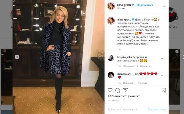 Алина Гросу в стильном леопардовом наряде рассказала, как проводит дни в предновогодней суете Известная украинская певица поделилась новым постом на своей странице в Инстаграм. Об этом пишет Politeka.net. Так, Гросу рассказала, что уже начала записывать всевозможные новогодние поздравления. «День в беготне, в записях всех новогодних поздравлялок, чтоб поднять ваше настроение и сделать его более праздничным», - написала певица.