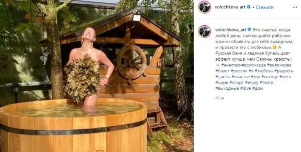 При этом Волочкова рассказала, что «баня и ледяная купель дает эффект лучше, чем салоны красоты!». На опубликованных кадрах покрасневшая Волочкова позирует уже в купели, прикрыв пикантные места веником из бани. При этом комментарии знаменитость продолжает держать закрытыми из-за наплыва пользователей, которые обвиняют ее в двуличии и лицемерии. До этого мы писали, что российская балерина Анастасия Волочкова удивила кадрами, сделанными во время домашней тренировки «Экзерсис в привычной обстановке», - коротко говорится в сообщении. Обратим внимание, что на опубликованных кадрах располневшая Волочкова тренируется, держась рукой за балетный станок. В какой-то момент знаменитость сбрасывает курточку, изрядно при этом пропотев. Напомним, скандальная Волочкова сделала свой фирменный шпагат в компании мужчин А еще Politeka писала, бесстыжая Волочкова задрала балетную пачку и засветила пикантные места Также Politeka сообщала, Волочкова сверкнула исхудавшими ногами в шерстяных сапогах
