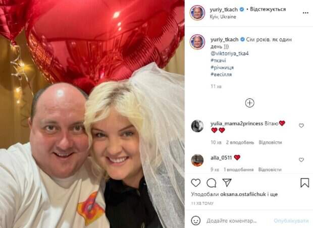 На фото жена Виктория, такая же веселая и задорная, очень похожа на Юрия, просто светится от счастья. "Семь лет, как один день)))" - написал комик. Фанаты были удивлены, увидев такую родную пару, они пожелали много хороших слов для молодых, и отметили, что Юрий очень похож с женой: "Счастя вам, вы классные!", "Горько !❤️", "Сім