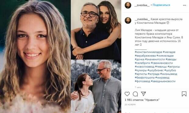 В социальных сетях опубликовали коллаж из снимков, на которых 16-летняя Лия трогательно обнимает своего папу Константина Меладзе. "Какая красотка выросла у Константина Меладзе. Лия Меладзе - младшая дочка от первого брака композитора Константина Меладзе и Яны Сумм. В этом году девочке исполнилось 16 лет", - говорится в подписи к публикации. Комментаторы сравнили ее с бывшей вокалисткой ВИА Гры Эрикой Герцег и отметили, что дочь Константина Меладзе скоро затмит своей красотой Веру Брежневу. "Так и жена ж там великолепная, не то, что та Галушка", "У Меладзе.. Наверно, у его бывшей жены выросла. Он-то в стороне вОшкался", "Скоро Брежневу затмит молодостью и красотой", "Красивая девочка. Счастья ей желаю", "От такой мамочки, только такие прелестные, красивые детки", "В Галушке нет породы", "На Эрику похожа", - написали фанаты под публикацией. Ранее мы рассказывали о драме в семье Валерия Меладзе. 28-летняя Инга Меладзе призналась, что рассталась со своим возлюбленным Денисом. По ее словам, 2020 год выявился для нее очень тяжелым и их публичные отношения с Денисом были прекращены. Наследница Валерия Меладзе также поблагодарила близким за поддержку и за то, что они помогают ей "выкарабкаться со дна этой эмоциональной ямы". Напомним, повзрослевшая дочь-красотка Меладзе скоро затмит Веру Брежневу Как сообщала Politeka, новые девушки Меладзе осрамились с выходом в свет Также Politeka писала, что Меладзе плюнул на все и признался, как изменял жене с Джанабаевой