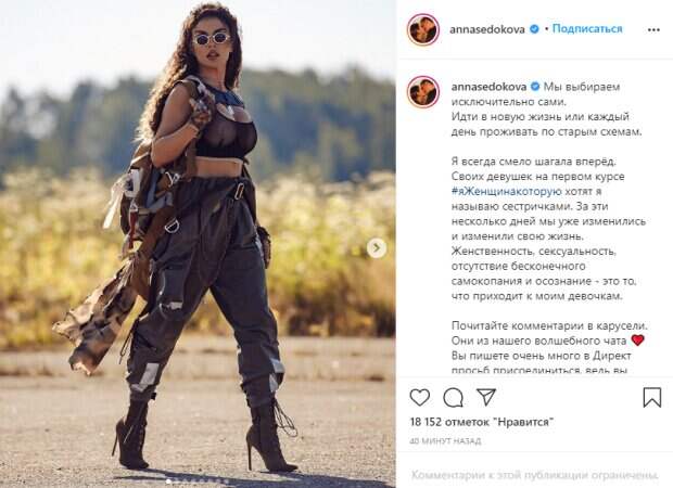 На фото певица предстала в постапокалиптическом образе: топе с вырезом на самом пикантном месте, штанах необычного кроя с цепями, рюкзаком с полосками ткани, развевающимися на ветру, и ботильонах на высокой шпильке. Кучерявая Анна в круглых солнцезащитных очках застыла во время шага. "Мы выбираем исключительно сами. Идти в новую жизнь или каждый день проживать по старым схемам. Я всегда смело шагала вперёд. Своих девушек на первом курсе #яЖенщинакоторуюхотят я называю сестричками. За эти несколько дней мы уже изменились и изменили свою жизнь. Женственность, сексуальность, отсутствие бесконечного самокопания и осознание - это то, что приходит к моим девочкам", - поделилась певица, призывая дам присоединиться к ней. Пользователи с жаром кинулись обсуждать Седокову в новом образе "гуру": "Анютка, вытащи вату из лифана 😁👍" "О боги!!!! 🤪🤪🤪 Нереальная !!!❤️" "Этот ракурс не очень , Анна" "Вдохновляет!" "Горячая Клеопатра" "Уф Аня🔥🔥" "Ух!🔥 Валькирия!!" "*дь, сколько же ло*ов у нас, деньги можно лопатой грести 🤣🤣" "Вы молодец Анна!Думаю ваши фанаты гордятся вами)))🔥🔥🔥" Напомним, бесстыжая Седокова в кружевном лифчике показала формы на публике. Как сообщала Politeka, раздетая Седокова посветила прелестями в шальном образе Красной шапочки: "Ждет своего волка". Также Politeka писала, что игривая Седокова в соблазнительном купальнике изогнулась и показала наслаждение.