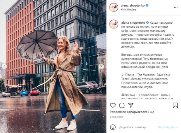 Так, в этот раз звездная красотка поделилась очаровательными кадрами из новой фотосессии под дождем, а в подписи к ним рассказала, как борется с плохим настроением. На новых фотографиях Алена запечатлена на улице во время дождя, она танцует и порхает, держа в руках зонтик. Перед камерой красотка появилась в коротких джинсах и горчичном топе, поверх которого накинула стильный бежевый плащ. Ее волосы распущены и слегка влажные от дождя, а на лице легкий макияж и милая улыбка. В подписи к публикации Шоптенко рассказала о своих способах и ритуалах борьбы с грустью и плохим настроением. Когда пасмурно не только за окном, но и внутри себя, меня спасают маленькие ритуалы – простые способы поднять настроение, когда совсем нет сил. У каждого они свои, так что давайте делиться. Вот вам моя оптимистичная суперпятерка! Пять безотказных источников радости, когда мой эмоциональный ресурс на нуле", - написала хореограф и поделилась музыкой, фильмами, вкусностями, которые поднимают ей настроение. Напомним, Шоптенко из «Танців з зірками» вскружила голову игривым перевоплощением: «Кошечка» Как сообщала Politeka, Алена Шоптенко решилась показать себя без макияжа, поделившись открытием: "Не работает. ..". Также Politeka писала, Шоптенко из "Танців з зірками" с идеальной укладкой и макияжем пошалила за рулем: "Планы на день...".