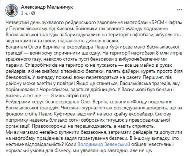 В компании предупредили об угрозе взрыва: на территории базы хранятся бензин, дизель и 8 млн литров сжиженного газа. Мельничук написал, что действия юриста Павла Куфтырева и главы Фонда ликвидации последствий Васильковской трагедии Олега Верника могут спровоцировать техногенную катастрофу, по сравнению с которой Васильковская трагедия "покажется мелочью". "Сотрудников на территорию не пускают – все имущество в руках рейдеров, которые не знакомы с техникой безопасности, жгут файеры, курят прямо возле бензовозов. В случае пожара они превратятся в ракеты "Першинг", полрайона может взлететь в воздух. Бандитам Олега Верника и экорейдера Павла Куфтырева мало Васильковской трагедии – они хотят привести к еще одной. На территории нефтебазы 8 млн литров сжиженного газа, вокруг стоят пустые бензовозы со взрывоопасными парами. В Василькове были бензин и дизель, а тут еще и 8 млн литров газа", – заявил директор департамента. Он добавил, что силовую поддержку "активистам" фонда оказывают около 100 вооруженных титушек из праворадикальной организации: они забаррикадировались на предприятии и забрасывают сотрудников нефтебазы камнями и покрышками, поджигают дымовые шашки. Титушки, по словам Мельничука, действуют под прикрытием и при содействии полиции. "Мы требуем остановить беззаконие, задержать рейдеров и допустить на нефтебазу сотрудников для гарантирования безопасности. В противном случае кто будет нести ответственность? Когда [президент Украины] Владимир Зеленский обещал инвестнянь и нормальные условия для бизнеса, мы ждали чего угодно, но не этого", – написал Мельничук.