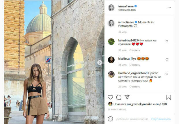 В своем новом посте Соня решила показать прогулку по местным старинным улочкам. На фото девушка запечатлена на фоне видов итальянской коммуны Пьетрасанта. Красотка показала свои модельные навыки, умело подбирая позы для снимков рядом с местной архитектурой. Для это прогулки Евдокименко подобрала максимально стильный и удобный образ. На ней были свободные бежевые шорты с поясом, а также оригинальный черный топ с кокетливыми вырезами, которые делали его больше похожим на лифчик. Отец Сони, сын Софии Ротару Руслан Евдокименко, а также ее брат Антон оценили фото. Поклонники также не смогли пройти мимо поста девушки. «Просто нет такого фона, который вы не сделаете прекрасным», «Ну какая же красивая», «Величина построек завораживает! Где же это вы, София?», «Малышка на миллион», - пишут люди. Напомним, внучка Софии Ротару показала своего брата-красавца, который вырос копией деда, в новом амплуа. Как сообщала Politeka, юная внучка Ротару порадовала бабушку элегантным образом с золотом. Также Politeka писала, что юная внучка Ротару спустила халатик, поразив пикантными фото на отдыхе.