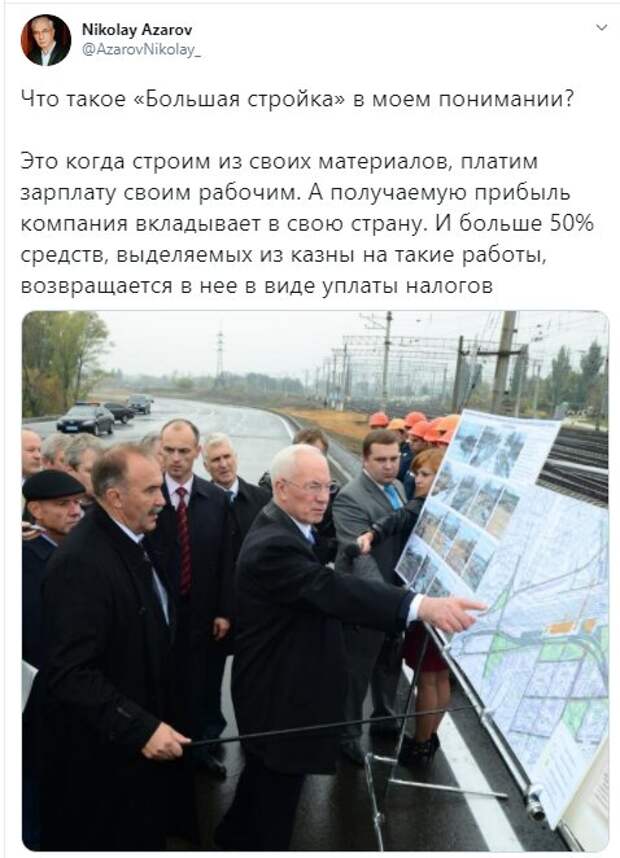 Бывший премьер-министр Украины Николай Азаров поделился своим видением "Большой стройки" в Украине Как передает Politeka.net, мысли экс-политик озвучил на своей страничке в Twitter. "Что такое «Большая стройка» в моем понимании? Это когда строим из своих материалов, платим зарплату своим рабочим. А получаемую прибыль компания вкладывает в свою страну.