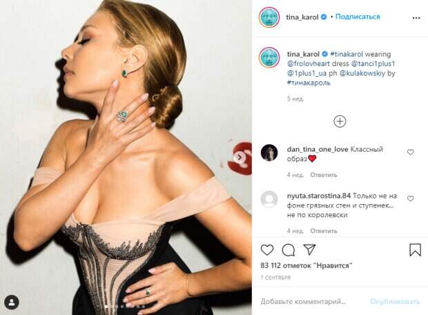 Одно из платьев Тины бурно обсудили в сети из-за необычного дизайна. Черное платье с бежевыми вставками, расшитыми камнями создало образ звезды, как у роковой искусительницы, однако очередной декольте и выпирающий животик озадачили видом. Часть фанатов все же оценила образ певицы, ведь по их мнению она выглядела очень даже мило: «Ну что сказать ? Платье, сказать , что никакое - ничего не сказать ! Тина потеряла нюх!; Классный образ❤️; Только не на фоне грязных стен и ступенек... не по королевски; Ты очень милая; И так красива, когда сдержанно, скромно и волнующе; Тина, платье 40+