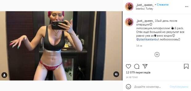 Покрещук сняла на видео себя в зеркале на 10-й день после липосакции. Она похвасталась, что уже сейчас прекрасно виден результат. На теле еще есть синяки, однако, по словам девушки, это нормально, и часто люди "просто черные выходят" после такой операции. "10-й день после операции. Липосакция, липофиллинг. 6 pack. Отек еще большой, но результат все равно уже ох****о видно", - написала она. В комментариях мнения фолловеров разделились - одни не понимают, зачем надо было в очередной раз "ложиться под нож", а другие выражают восхищение результатам после липосакции. "Попа тоже классная", "Ой, ты какая-то толстая стала. До операции ты стройная была. А сейчас ж***, ляхи - как будто ты очень поправилась. Ничего личного, мое мнение", "Какая попа", "Я бы таких стрелял! Как бешеных собак", "Вопрос: зачем", - пишут в комментариях. Напомним, звезда "От пацанки до панянки" Покрещук удивила горячими танцами после операции А еще Politeka писала, что звезда "От пацанки до барышни" Крещук завоевала признание украинок, высказав жесткую правду о мужчинах Также Politeka сообщала, что звезда "От пацанки до панянки" Похрещук удивила образом после операции.