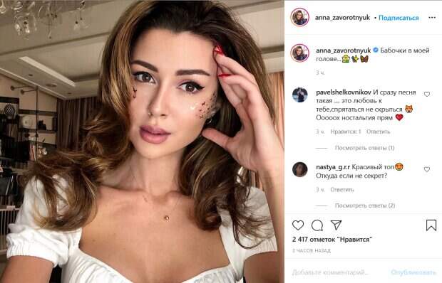 Дочь больной раком российской актрисы Анастасии Заворотнюк показала себя в оригинальном образе с бабочками Анна Заворотнюк поделилась новым фото на своей странице в Инстаграм, сообщает Politeka.net. На фото девушка позирует перед камерой в нежной белой кофте с глубоким декольте. Анна завила волосы и добавила своему лицу лоска при помощи нежного макияжа.