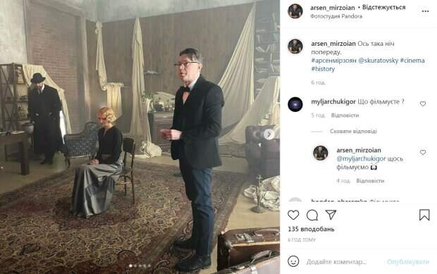 При этом Мирзоян показал кадры в ретро, сделанные в одной из киевских фотостудий. На них изображены харизматичные актеры в одежде прошлого века и съемочная группа. На одном из кадров посередине комнаты на стуле сидит хрупкая блондинка по бокам от которой стоят два мужчины. Мирзоян не стал вдаваться в детали и рассказывать, что именно происходило на съемочной площадке. Возможно, поклонники певца скоро смогут насладиться новым клипом. После увиденного у фолловеров артиста возникло много вопросов. "Что снимаете?",- спрашивали его в комментариях. Однако певец решил держать интригу. » Что - то снимаем", - уклончиво ответил он. Напомним, ранее артист на своей странице в Instagram опубликовал фото с Тоней Матвиенко, сделанные 10 лет назад. На фотографиях тогда еще будущие супруги позирует в студии звукозаписи во время записи совместной песни. Напомним, муж Тони Матвиенко Арсен Мирзоян ошарашил заявлением: "предлагаю свои фоточки по недешево..." Как сообщала Politeka, Арсен Мирзоян показал подросшую дочь от Тони Матвинко: "программа минимум выполнена" Также Politeka писала, что извращенец набросился на дочь Тони Матвиенко, пугающие подробности: "Он прижал и сказал…"