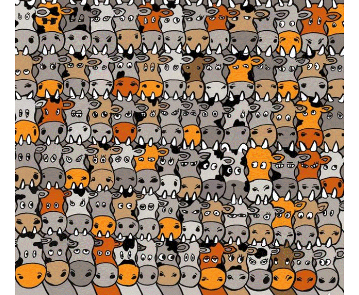 Иногда на картинках по которым проходят тесты нарисованы много одинаковых животных и сразу тяжело сориентироваться и обнаружить то, что необходимо найти. В этом тесте нужно найти собачку среди множества коров. С первого взгляда может показаться, что это несложный тест, однако можно с уверенностью сказать, что мало кому сразу удается найти собачку.