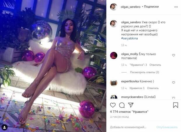 Артистка присела на лавочку, выставив вперед стройные и сияющие ножки. Большое декольте немного оголило грудь знаменитости. Тонкие бретельки держались на плечах, едва не соскальзывая. Макияж с акцентом на глаза и губы дополнил образ. Вокруг Ольги были разбросаны диско-шары. "Уже скоро