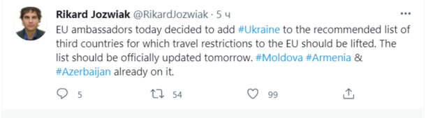 Официальный документ по этому поводу должны обновить завтра Европейский Союз планирует снять ограничения для въезда на свою территорию из Украины. Ограничение должны снять уже в четверг, 15 июля. Об этом сообщил брюссельский корреспондент "Радио Свобода" Рикард Йозвяк у себя в Twitter. Окончательное решение – за государствами-членами, но фактически ЕС дал "зеленый свет", чтобы украинцы беспрепятственно могли ездить в Европу "Послы ЕС сегодня решили добавить Украину в рекомендуемый список третьих стран, для которых следует снять ограничения на въезд в ЕС.