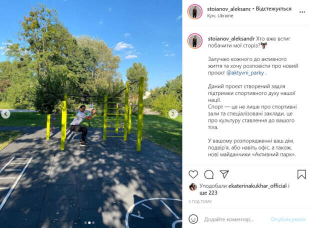 Привлекаю каждого к активной жизни и хочу рассказать о новом проект @aktyvni_parky. Данный проект создан для поддержки спортивного духа нашей нации. Спорт - это не только о спортивных залах и специализированных учреждениях, это о культуре отношение к вашему телу. В вашем распоряжении ваш дом, двор, или даже офис», - отметил Стоянов. По его словам, просканировав QR-коды на новых спортивных локациях, можно открыть для себя новые упражнения для всего тела. «Я считаю, что такой проект важнейший, ведь в здоровом теле - здоровый дух. Спорт помогает от плохого самочувствия, настраивает ваш мозг на активную работу, ведь действие порождает действие!», - обратился Стоянов к поклонникам. Напомним, что Екатерина Кухар со Стояновым устроили парад этнических костюмов: "Каждый из нас – это…". Как сообщала Politeka, Екатерина Кухар со Стояновым показали, чем занимаются перед концертом: «Мысли о…». Также Politeka писала, что Кухар расцеловала Юрия Горбунова: "Дорогой мой...".