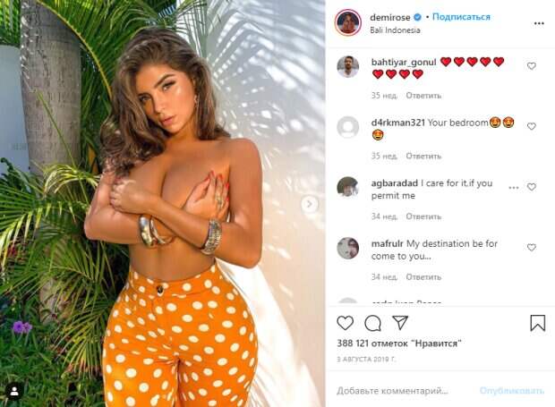 Модель Деми Роуз, также известная как британская Кардашьян, показала яркий образ в одних брюках в крупный горошек Загорелая звезда любит понежиться на солнце в смелых образах. После того, как модель избавилась от комплексов, связанных с лишним весом, она начала подчеркивать свои достоинства провокативными образами в белье.