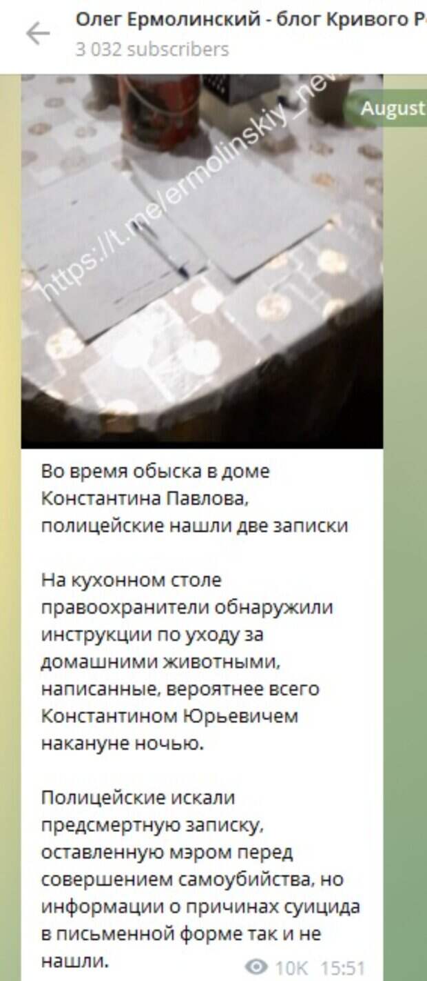 Дело гибели Константина Павлова, мэра Кривого Рога, обрастает любопытными деталями На данный момент следствие рассматривает три версии случившегося: убийство, самоубийство или неосторожное обращение с оружием. Правоохранители продолжают работать с женой погибшего. В Телеграм-канале местного блогера Олега Ермолинского отмечается, что следователи нашли две записки в доме Павлова, написанные, вероятно, его рукой.