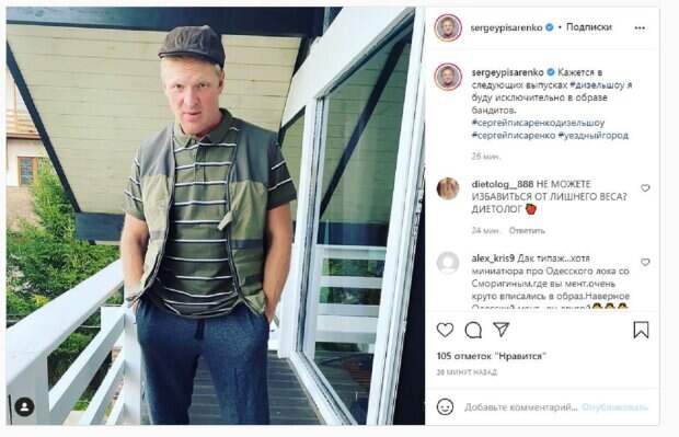Не забывает Сергей и о социальных сетях, где делится с фанатами самым интересным. На новом фото Писаренко был в шапке-козырьке, жилетке, футболке и штанах. В таком виде Сергей стоял на балконе, демонстрируя свой "бандитский" образ. "Кажется в следующих выпусках # дизель шоу я буду исключительно в образе бандитов", - написал Писаренко. Фанаты поставили более 100 лайков и написали свои рассуждения: "Дак типаж...хотя миниатюра про Одесского лоха со Сморигиным,где вы мент,очень круто вписались в образ.Наверное Одесский полицейский - он другой", "Вам подходит", "Мне, почему-то, рыбака напоминает". Напомним, звезды "Дизель шоу" Писаренко и его друг Никишин удивили отношениями вне сцены А еще Politeka сообщала, что актеры "Дизель шоу" пошли друг на друга с сжатыми руками, появились подробности Также Politeka писала, что звезда "Дизель шоу" Писаренко попал под шквал критики из-за видео с сыном-подростком