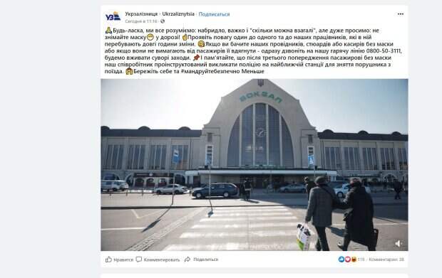 В "Укрзализныце" рассказали, как будут наказывать пассажиров без масок Об этом сообщается на Facebook-странице "Укрзализныци". "Помните, что после третьего предупреждения пассажиру без маски, наш сотрудник проинструктирован вызвать полицию на ближайшей станции для снятия нарушителя с поезда", - говорится в сообщении.