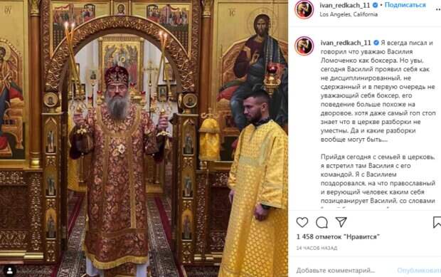 Между известными украинскими боксерами Василием Ломаченко и Иваном Редкачом произошел конфликт Как заявил Редкач на странице в Instagram, произошло это в церкви Лос-Анджелеса. Так, по его словам, он поздоровался с коллегой, на что Василий Ломаченко толкнул его. "Придя сегодня с семьей в церковь, я встретил там Василия с его командой.