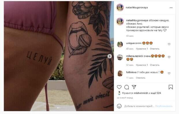 И хоть Алексей развелся с Ириной, но сохранил теплые отношения с названной дочерью и сыном. Сейчас молодая красотка активно ведет блог в Инстаграм и делится интересным. В этот раз Горовая показала свои татуировки. На фото можно увидеть частично руку и торс, а также бикини. "Целуй", - было написано на одной из тату, которая расположилась под купальником. "Обожаю каждую. Обожаю Аню. Обожаю родителей, которые своим примером вдохновили на тату", - написала Наташа. Фанаты поставили сотни лайков и написали комментарии: "Очень", "У тебя две новые?", "Обожаю тебя, такую веселую и красивую". Напомним, приемная дочь Потапа в крошечном топике похвасталась плоским животом, сделав селфии А еще Politeka писала, что сын и падчерица Потапа на отдыхе огорошили визгами весь пляж, кадры того, что просиходит Также Politeka сообщала, что экс-супруга Потапа с дочерью Наталией сделала переполох в Интернете, показав снимки с отдыха