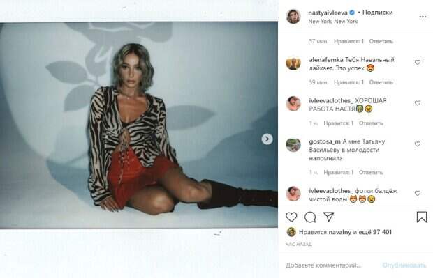 Так, на первом снимке Ивлеева в красной короткой юбке, длиных черных сапогах и леопардовой блузке, не скрывающей ее роскошной груди, сидит на полу. На втором фото ведущая сидит на корточках, выставив далеко вперед длинную ногу. На Насте – черные сапоги, сиреневая кофта и белый лифчик. Есть ли на ней нижняя часть одежды – непонятно. И, наконец, на третьем кадре Ивлеева находится якобы в полицейском участке, на фоне сетки для измерения роста преступников. Ведущая смотрит исподлобья, выражение лица у нее серьезное, можно отметить яркий цвет помады на губах девушки. Сутя по геотегу, сейчас Настя находится в Нью-Йорке (США). "Это я для себя", – подписала фото Настя. Фанаты бурно отреагировали на новые фото своей любимицы, поставив всего за час почти 90 тысяч лайков. "рай для глаз...