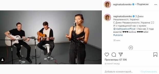 Так, звезда опубликовала видео, на котором исполнила песню украинской артистки Натальи Могилевской "Місяць". (Чтобы посмотреть, доскролльте до конца страницы) Тодоренко была в шелковой маечке с кружевом на декольте и серых джинсах. Звезда пела у микрофона, а позади нее можно заметить двух музыкантов, один из которых муж Регины - Влад Топалов. "С Днем Независимости, Украина! И с годовщиной нас с мужем @vladtopalovofficial! Уже как три года вместе) ❤️❤️❤️люблю ❤️❤️❤️тебя!", - написала Тодоренко. За полчаса пост собрал почти 70 тысяч лайков и много комментариев. "На украинском языке самые певчие песни... Очень красиво, приятно слушать 🌷❤️👏", "Регина,у тебя голос богини😍😍", "Просто прекрасно 👍👍👍 Счастья вам и безграничной любви ❤️❤️❤️", "Поздравляю с годовщиной, пусть ваша любовь преумножается... Счастья вам😇", "Мурашки по коже...", "Очень приятно, что Вы не забываете об Украине! А спели просто невероятно 😍😉👍", - написали пользователи сети. Напомним, Регина Тодоренко предстала в летнем образе. Звезда была в футболке оверсайз, которая лишь слегка выделила ее пышную грудь. Длинная юбочка с большим вырезом оголила стройные ножки звезды. Завершили образ соломенная шляпка и коричневые сапожки. Напомним, Тодоренко жестко опозорилась из-за неудачного замечания А еще Politeka писала, что Тодоренко показала, как развлекается со своими сладостями на отдыхе Также Politeka сообщала, что Тодоренко расплакалась после вопросов Ксении Собчак