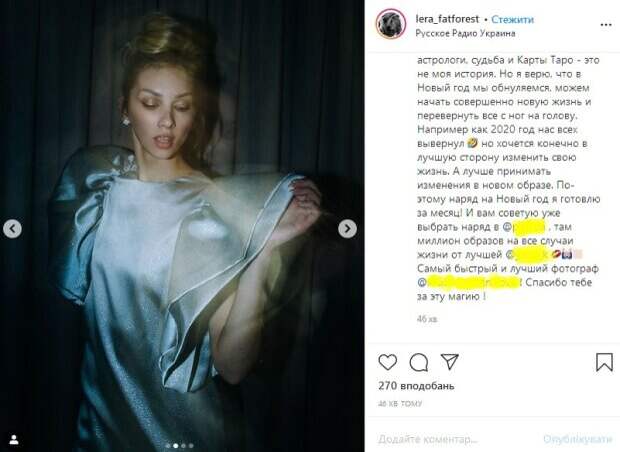 Звезда студии «Квартал 95» Лера Товстолес похвасталась безупречной красотой, примерив праздничное платье Снимком знаменитость опубликовала в Instagram, передает Politeka. «Я мало во что верю: гороскопы, астрологи, судьба и Карты Таро - это не моя история. Но я верю, что в Новый год мы обнуляемся, можем начать совершенно новую жизнь и перевернуть все с ног на голову.